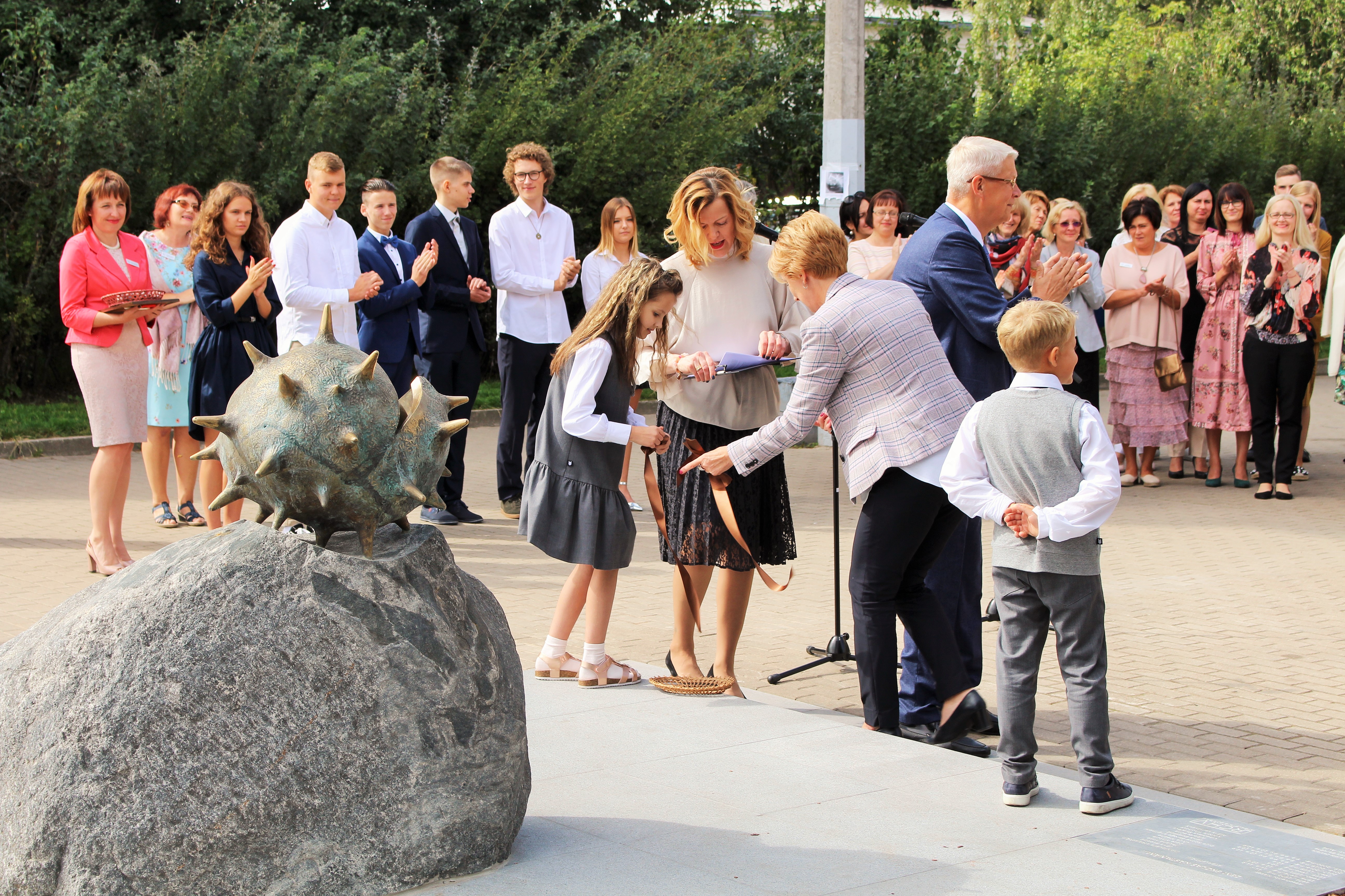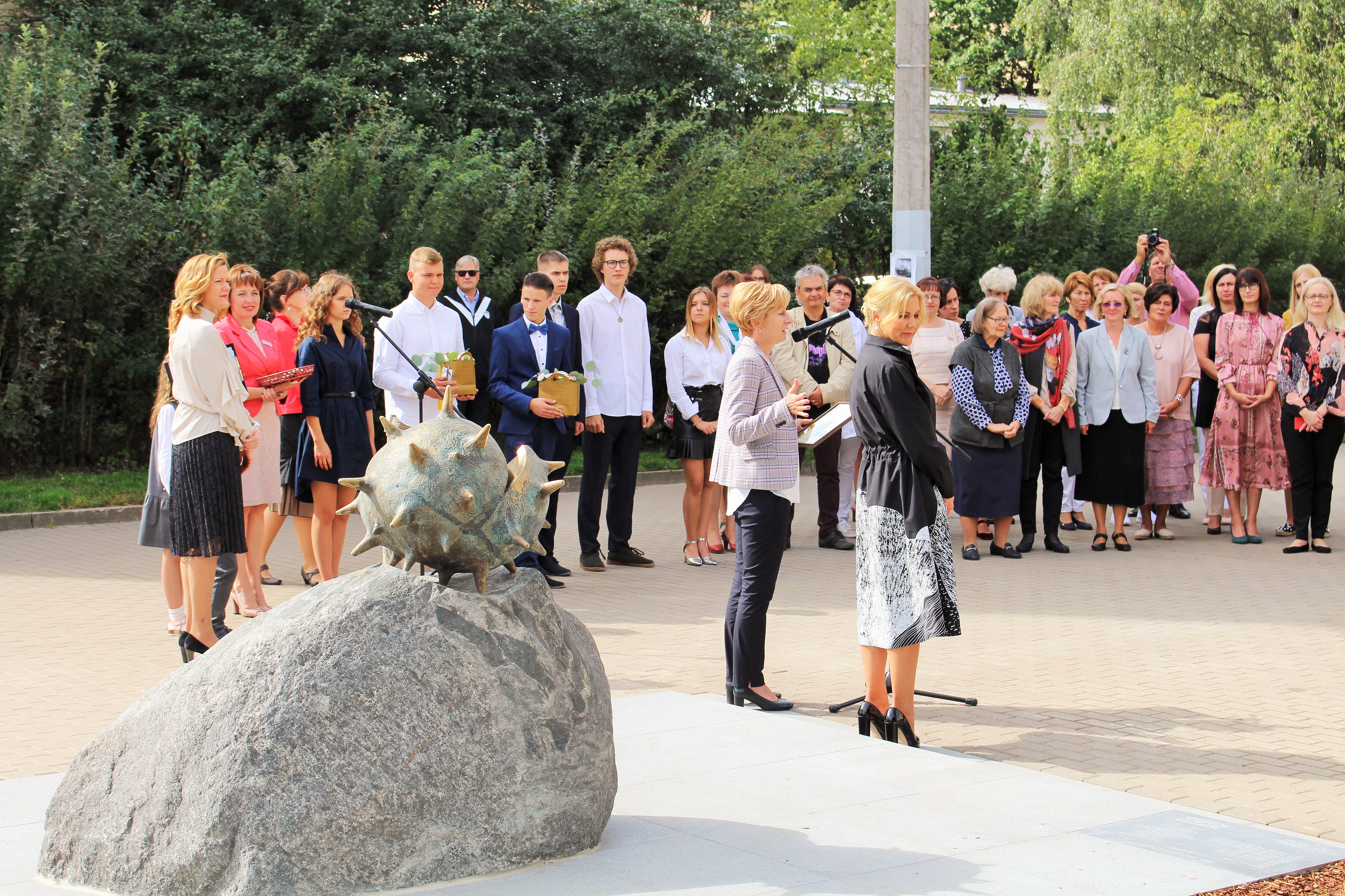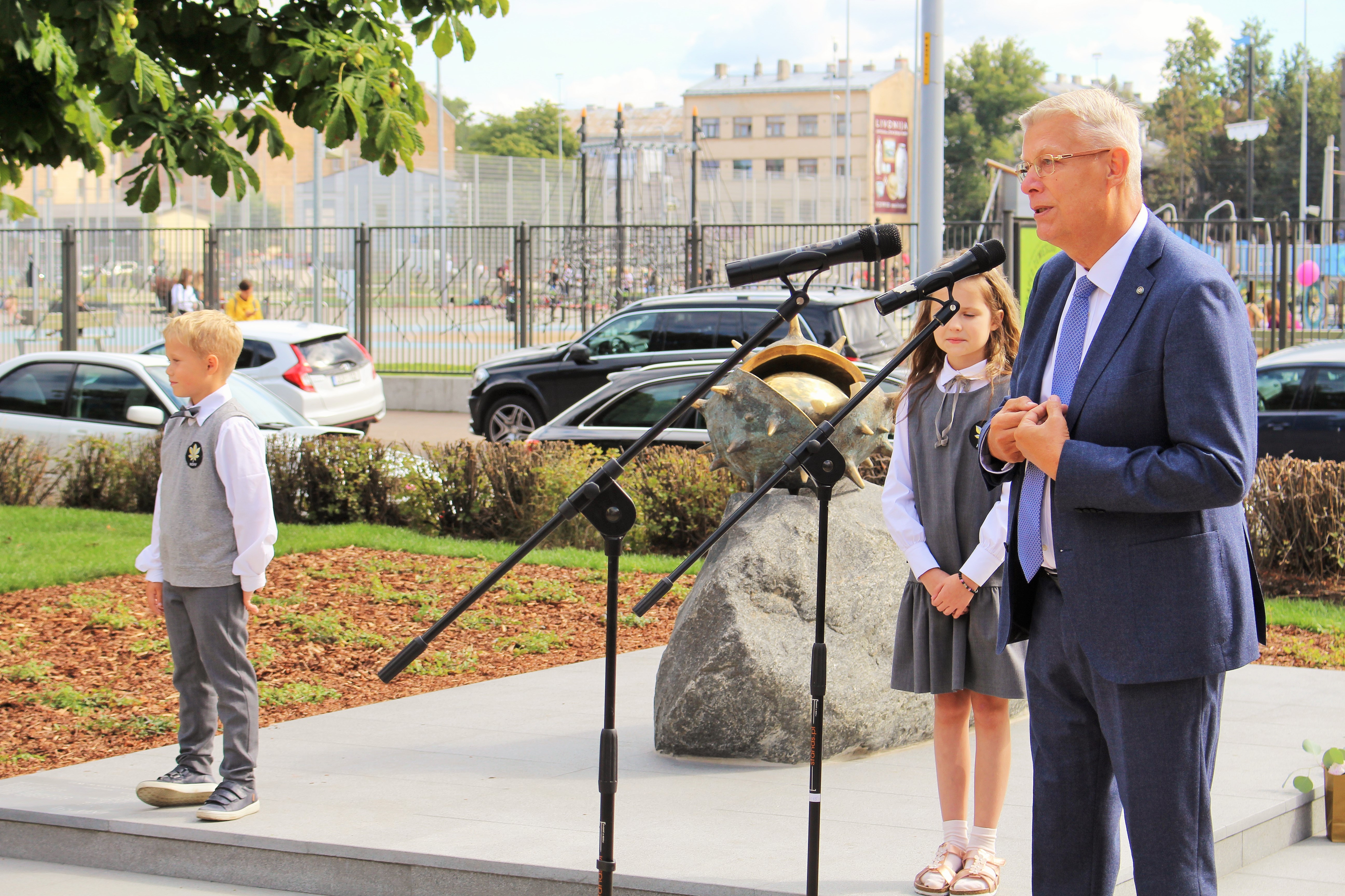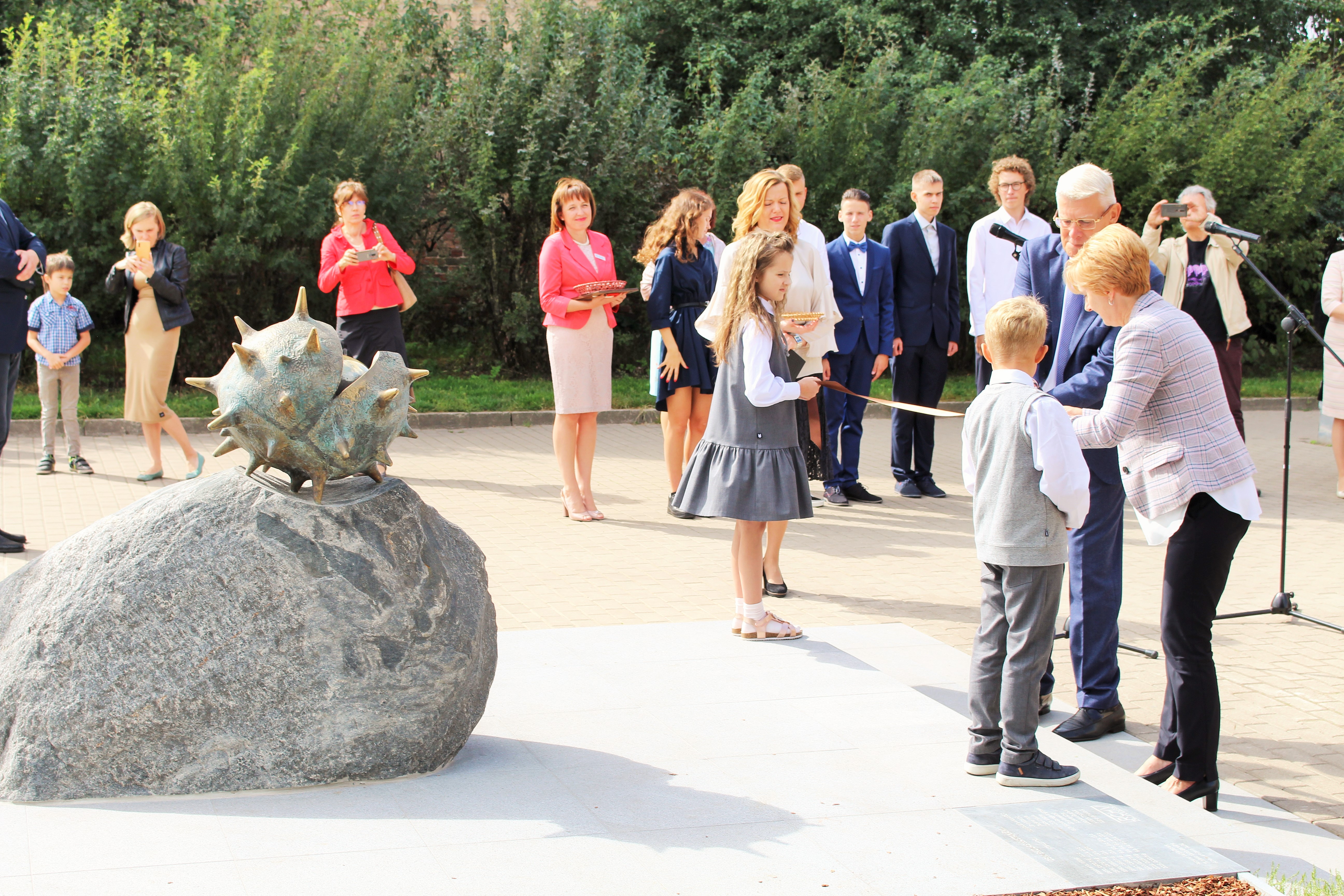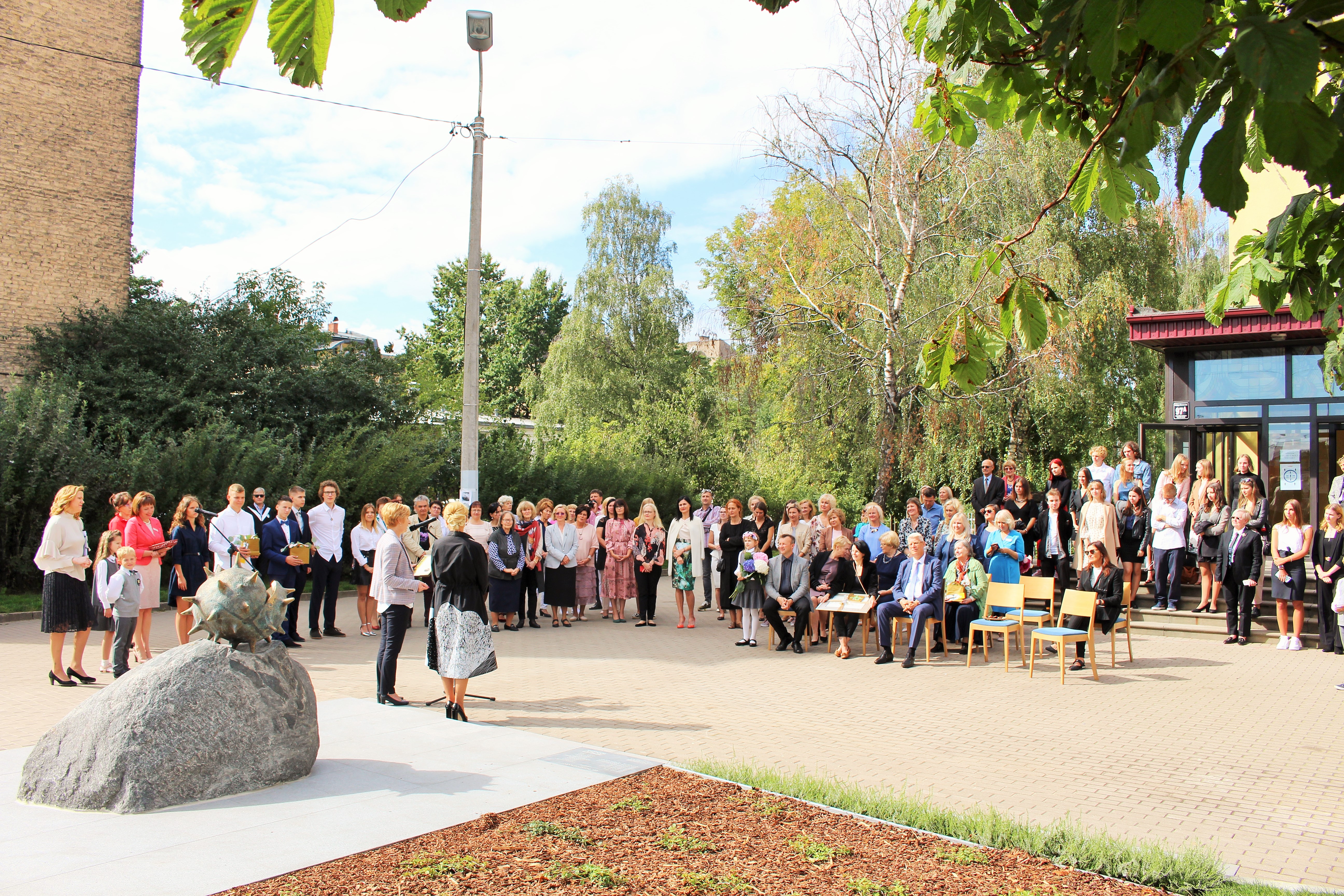 Atklāšanā piedalījās projekta patrons, Valsts prezidents Valdis Zatlers, skulptūras autors – tēlnieks Valtis Barkāns, atbalstītāji – dr. Dace Matule, dr. Evija Rodke – Sproģe, ainavu arhitekte Ilze Rukšāne, kuplā skaitā skolas bijušie un esošie pedagogi, absolventu klašu pārstāvji, himnas ieraksta solists Nauris Indzeris.