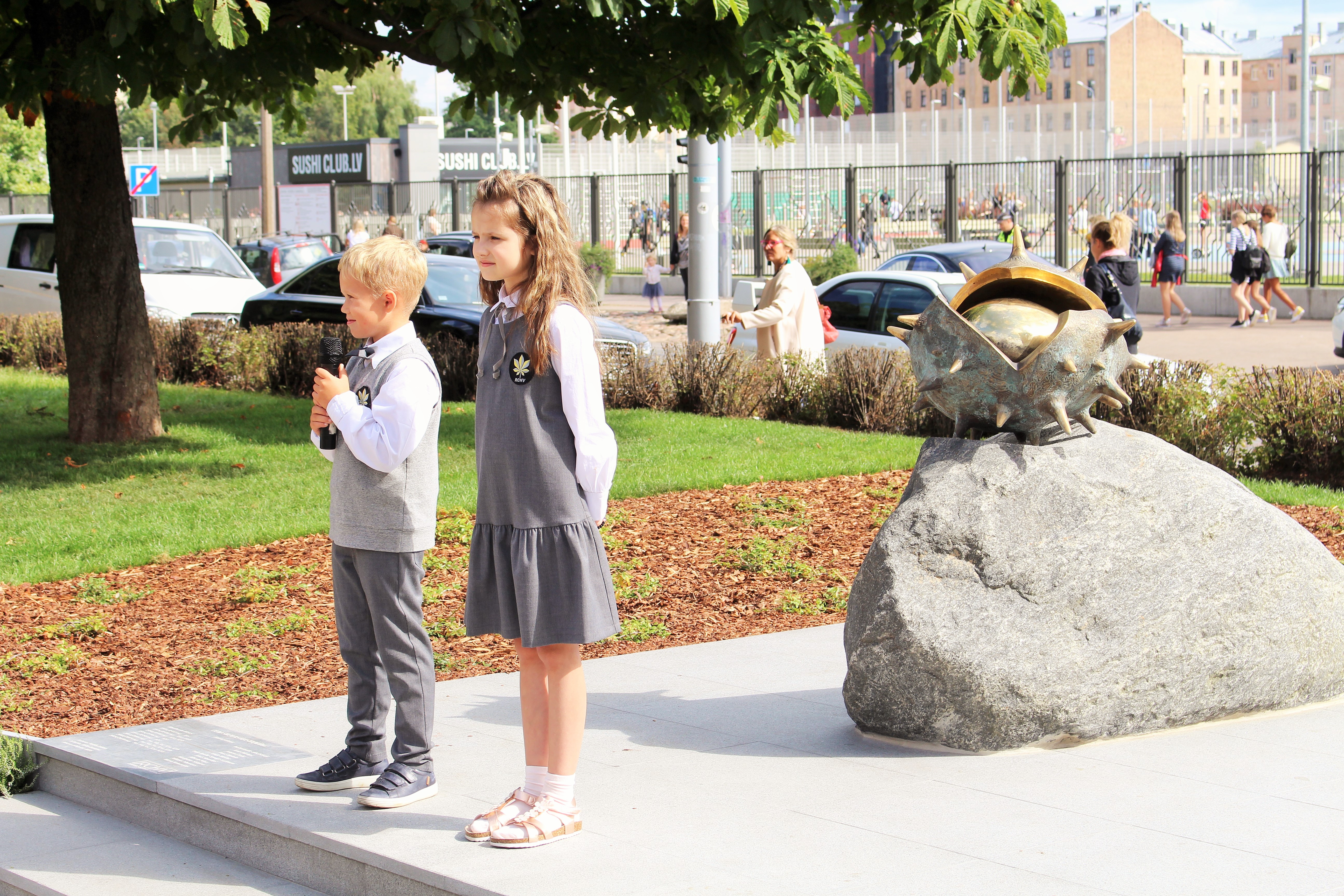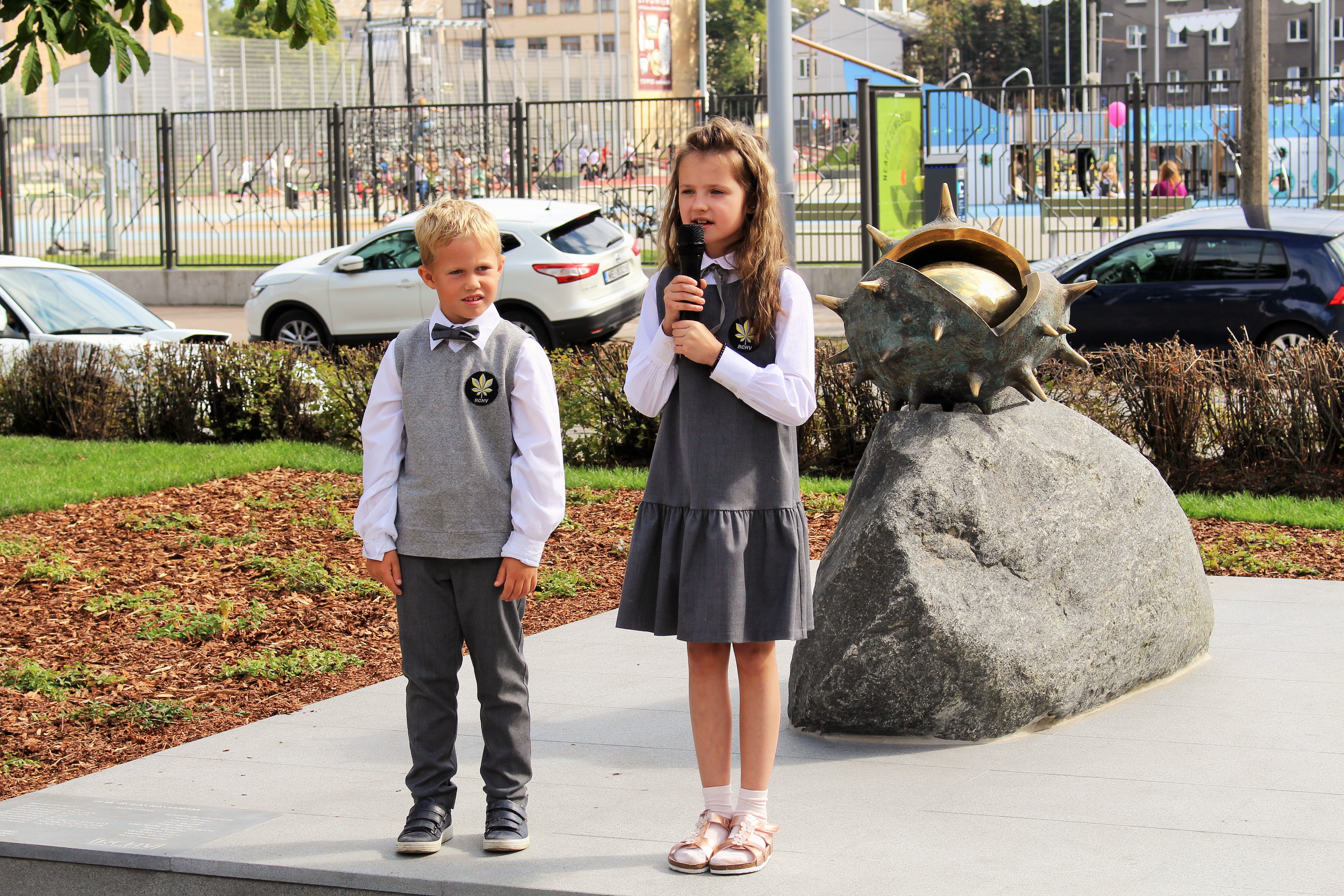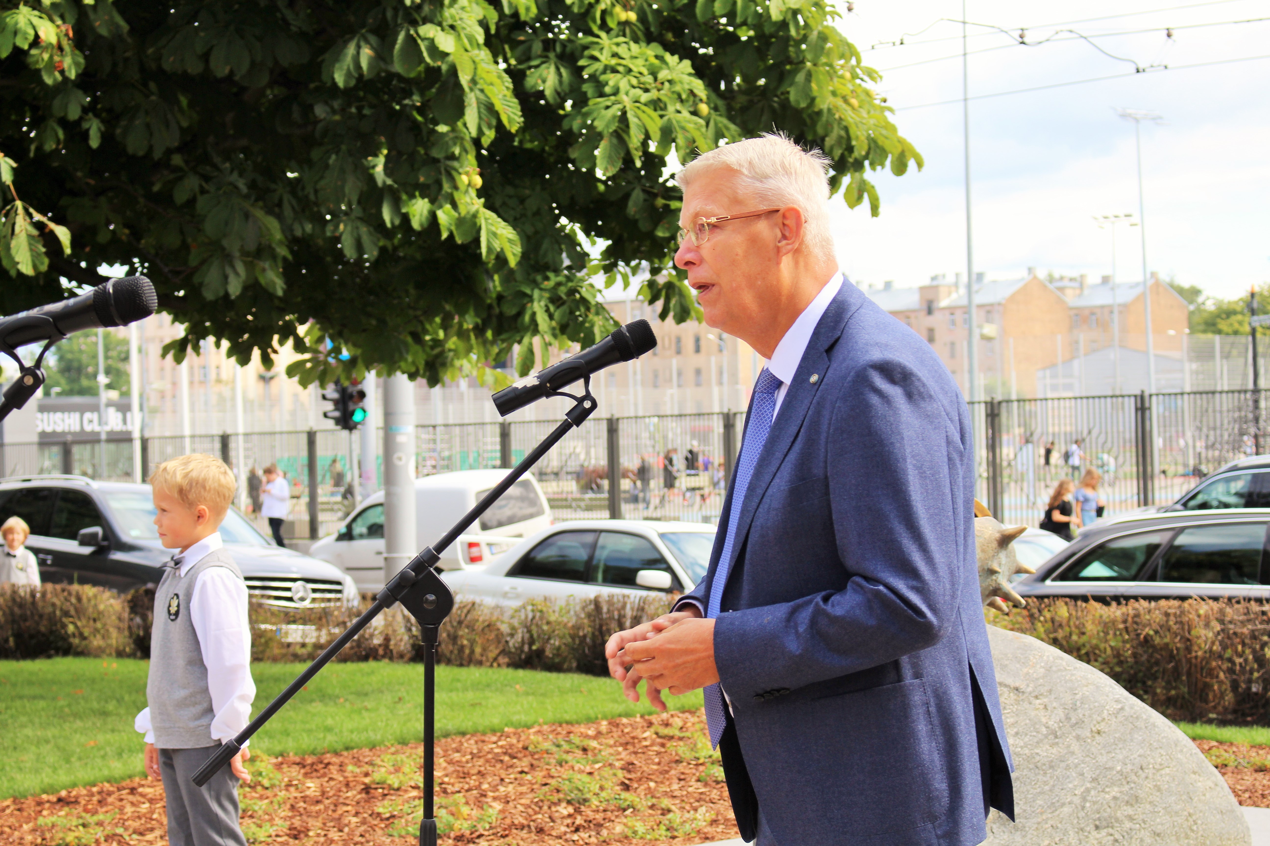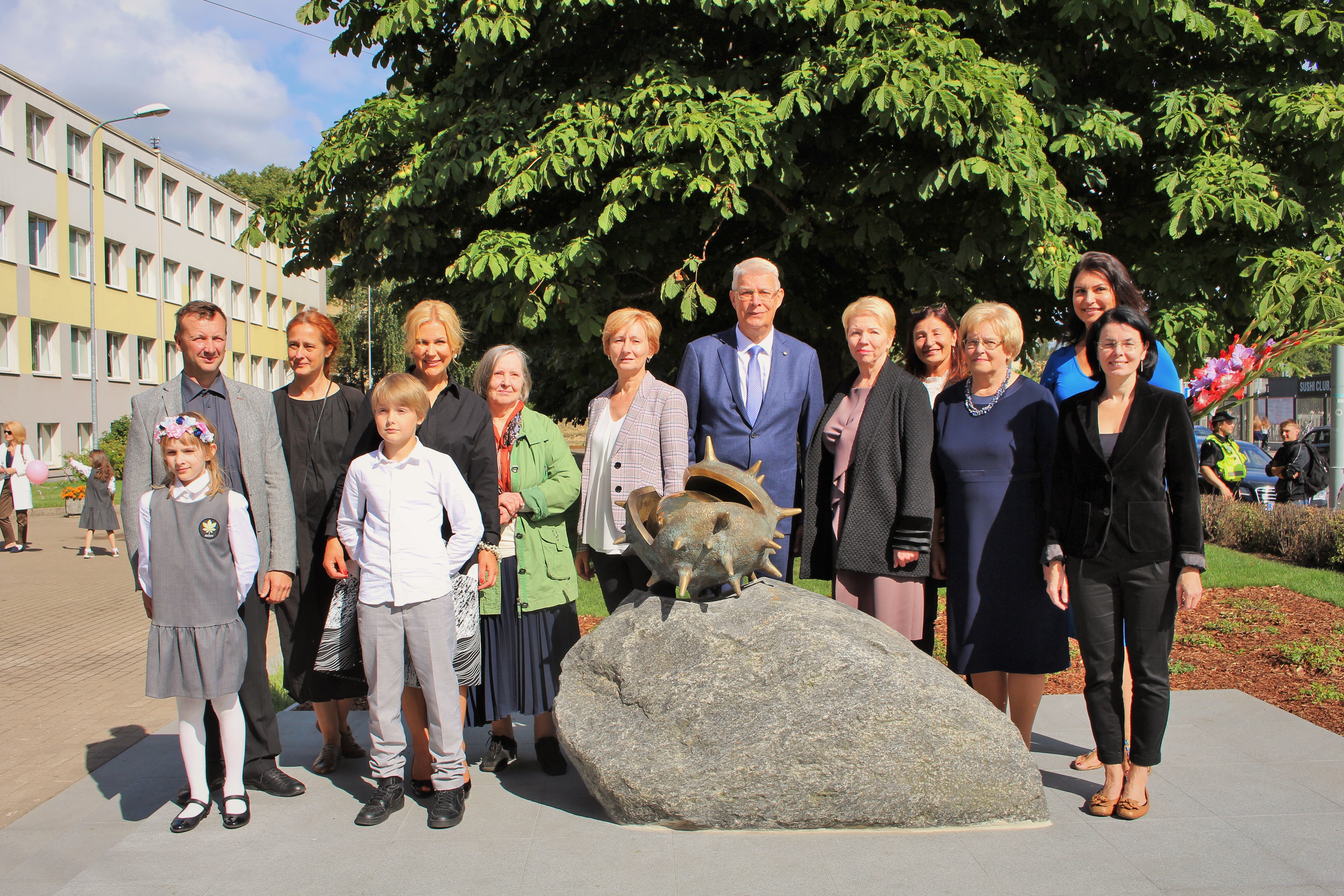Atklāšanā piedalījās projekta patrons, Valsts prezidents Valdis Zatlers, skulptūras autors – tēlnieks Valtis Barkāns, atbalstītāji – dr. Dace Matule, dr. Evija Rodke – Sproģe, ainavu arhitekte Ilze Rukšāne, kuplā skaitā skolas bijušie un esošie pedagogi, absolventu klašu pārstāvji, himnas ieraksta solists Nauris Indzeris.