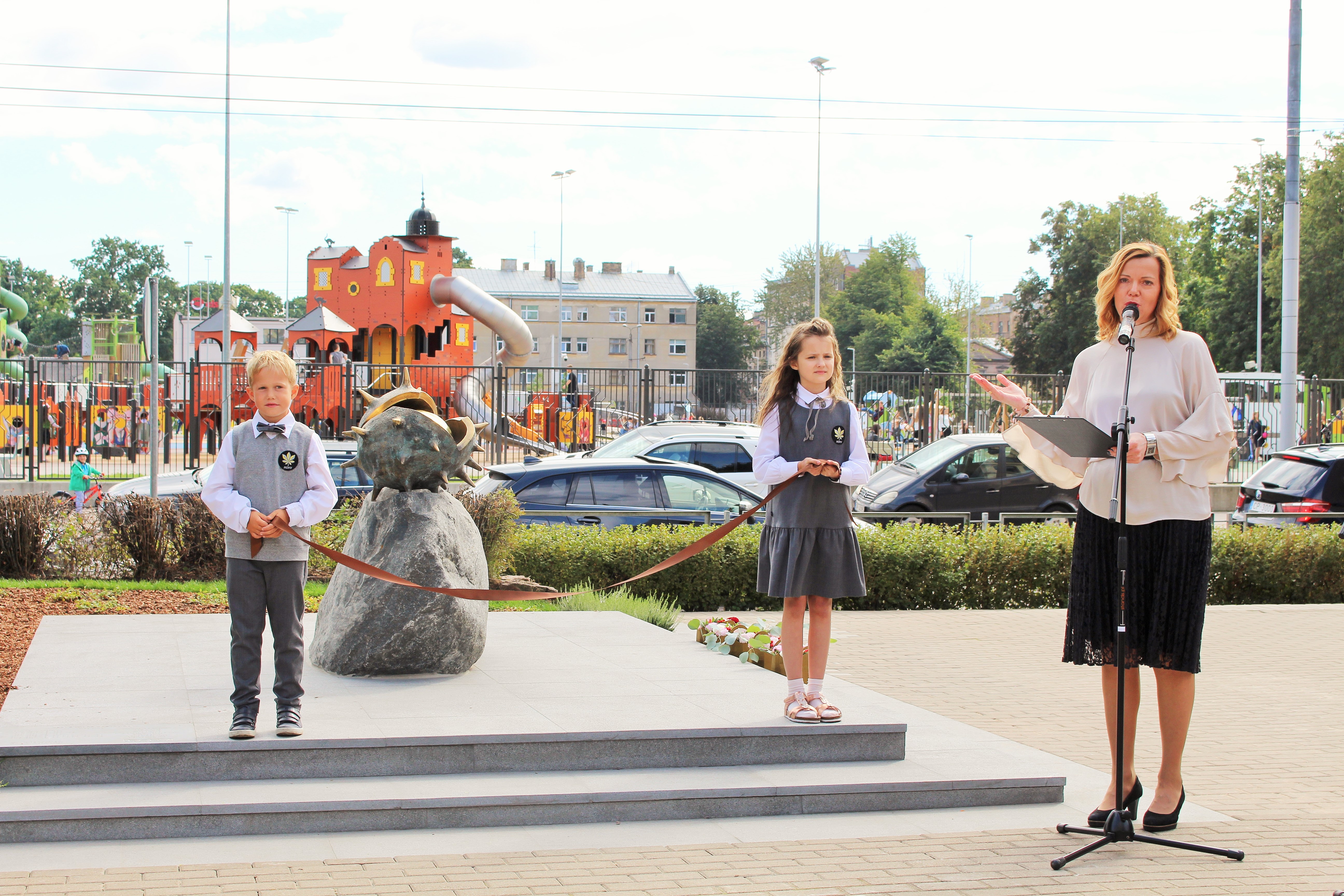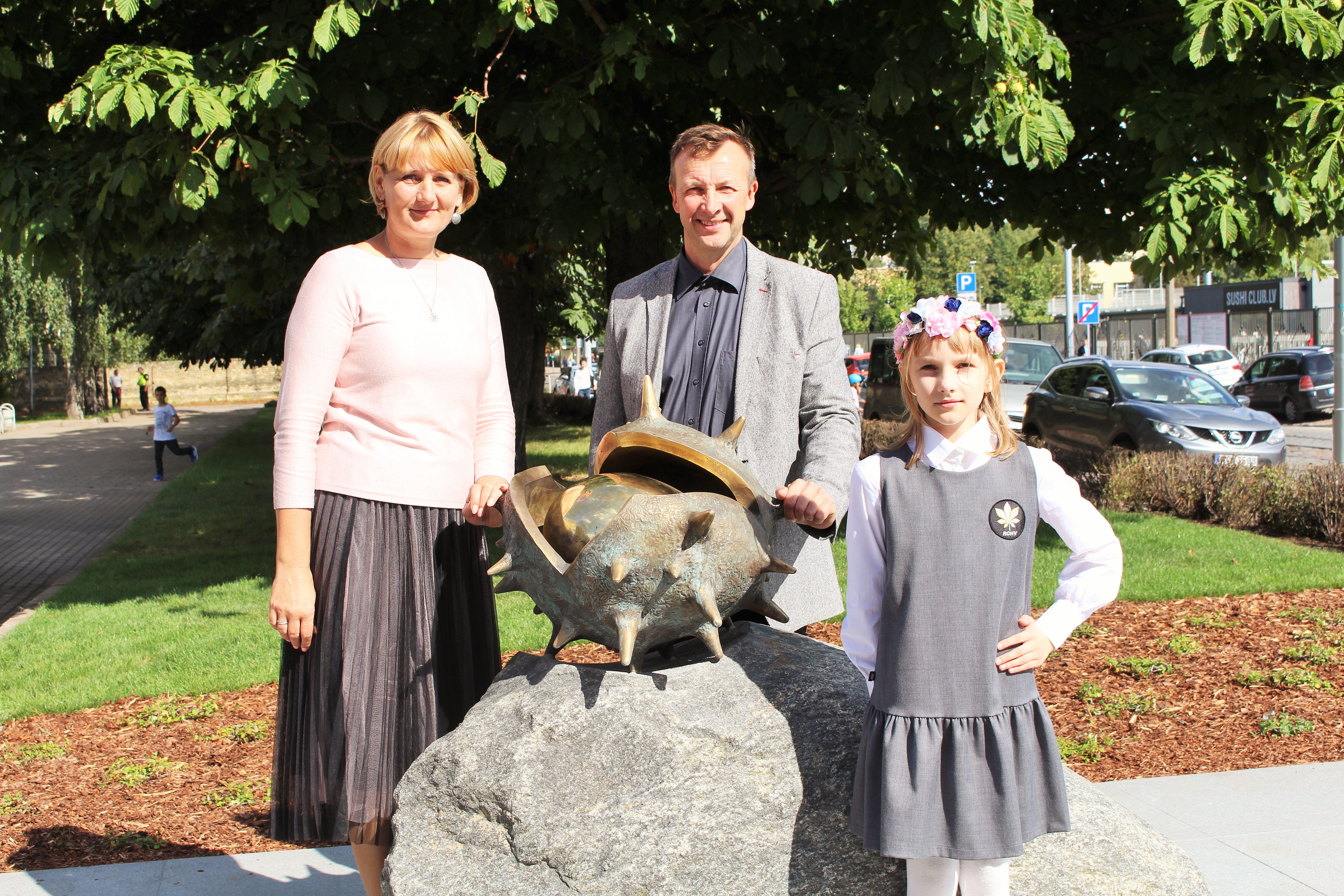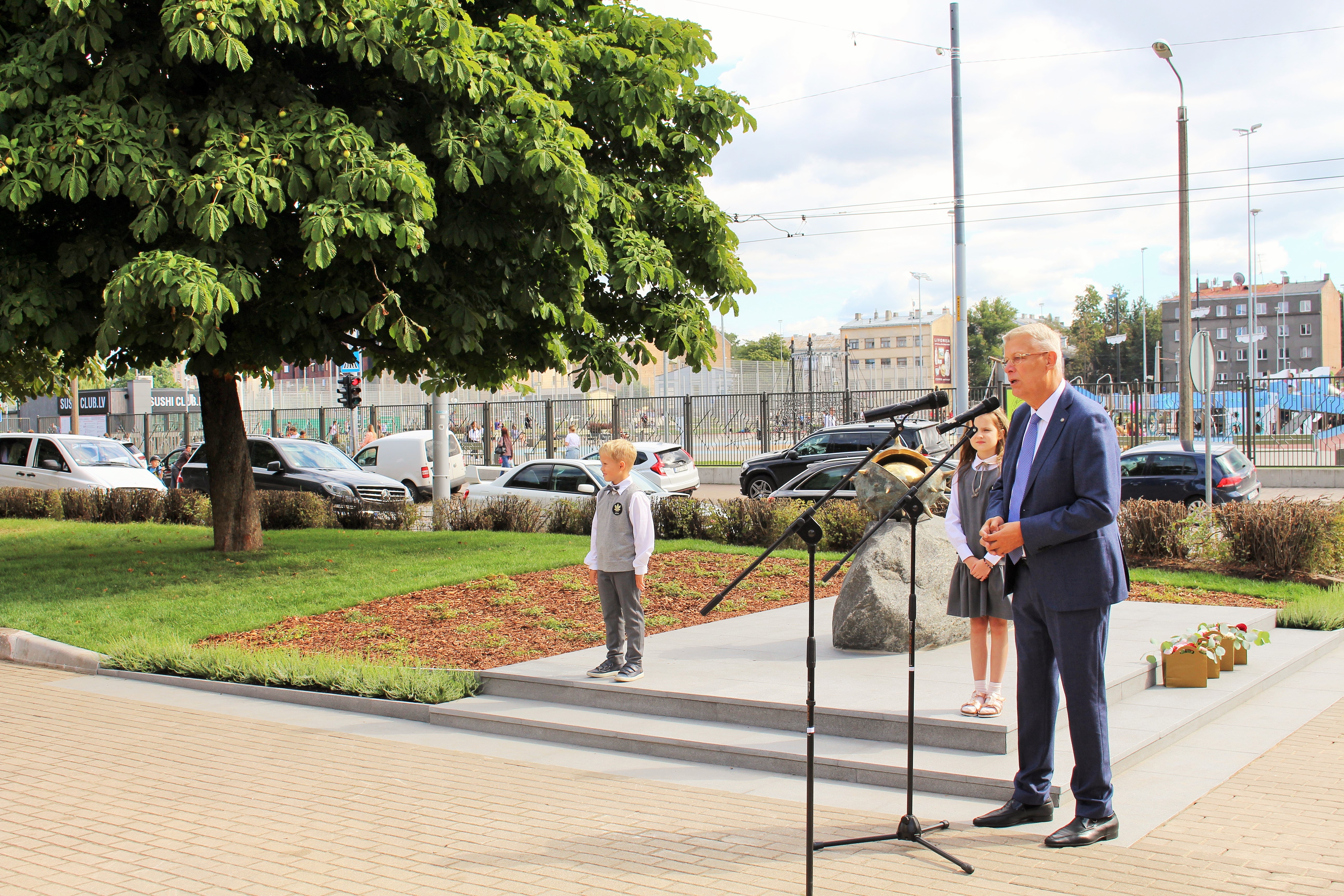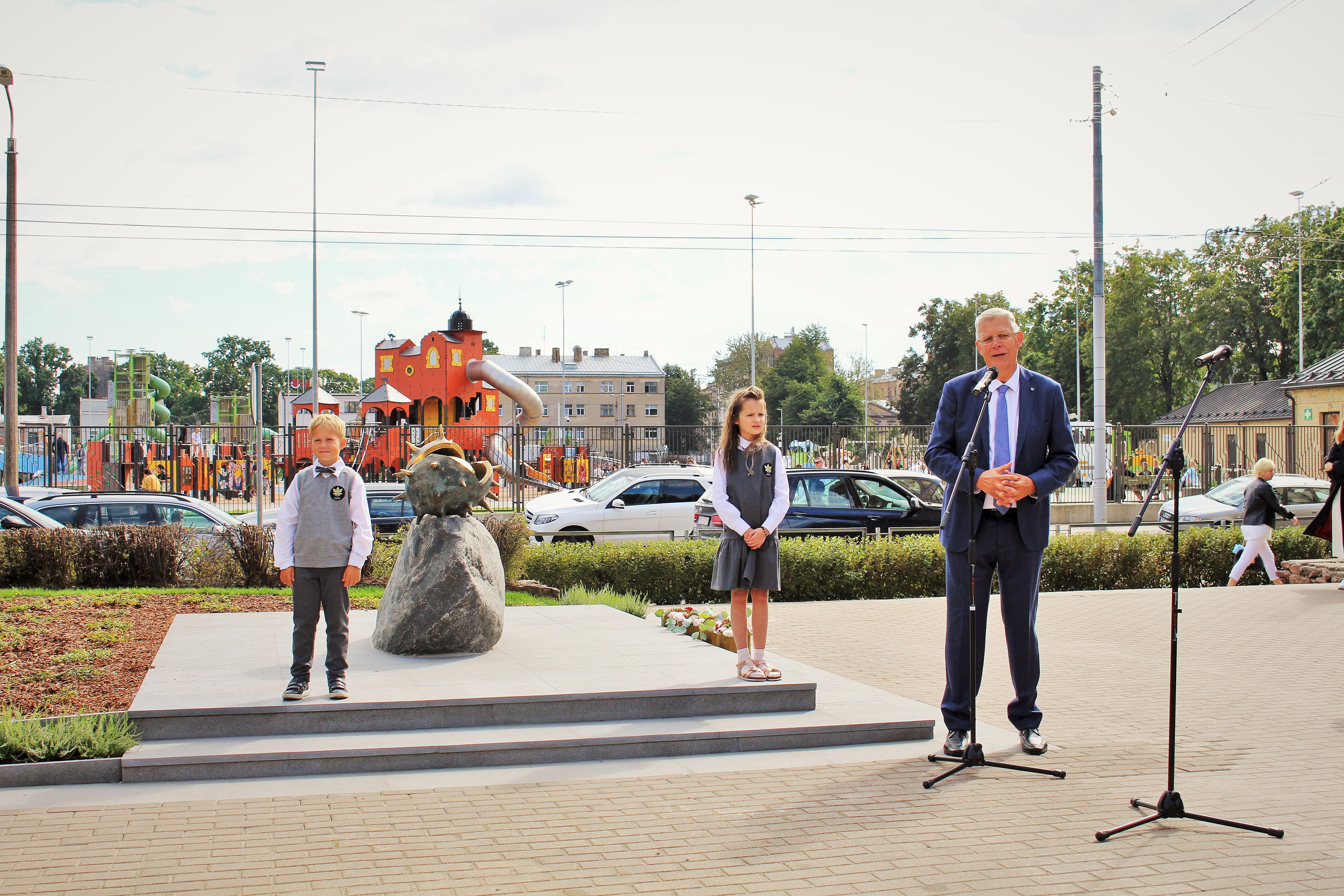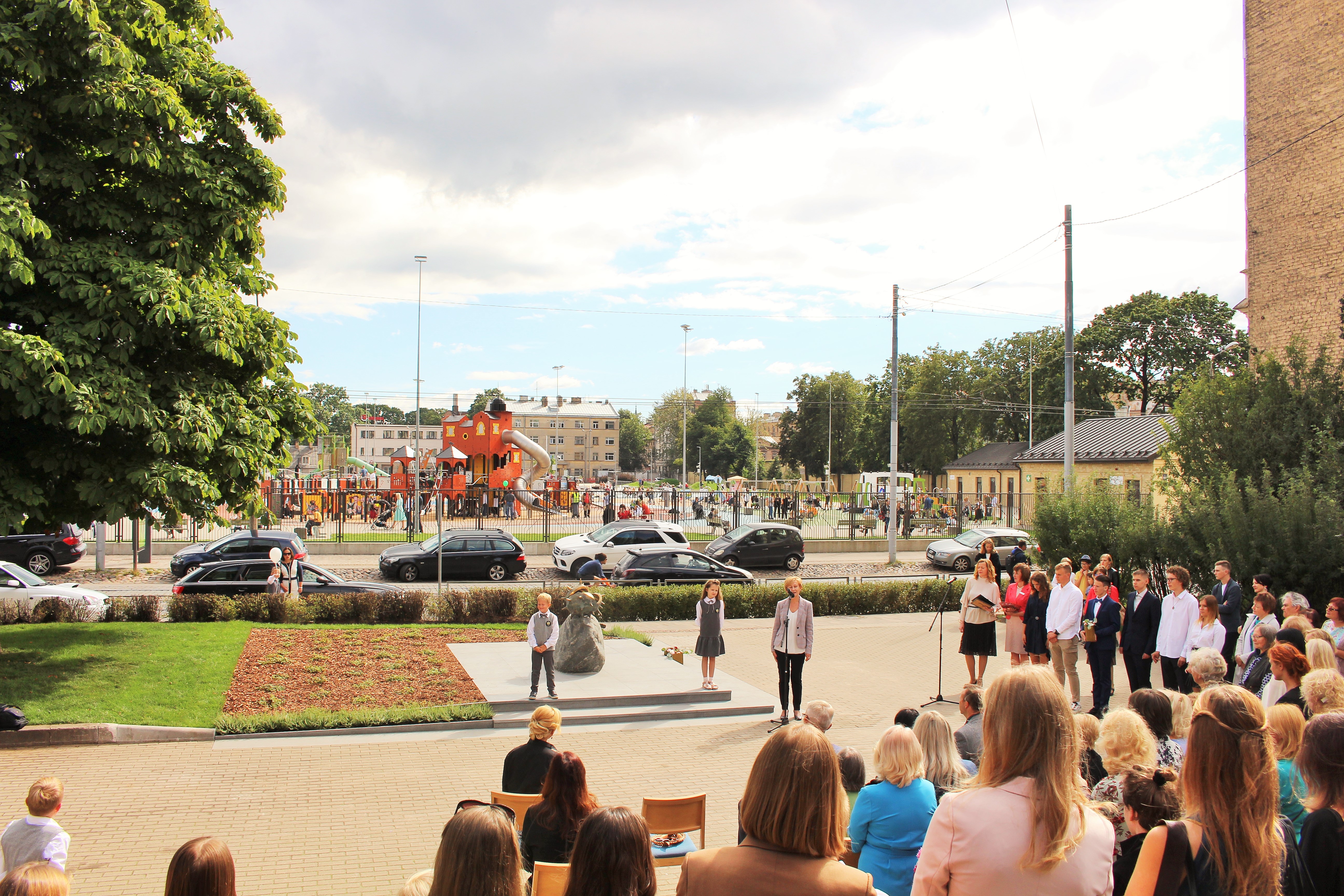 Atklāšanā piedalījās projekta patrons, Valsts prezidents Valdis Zatlers, skulptūras autors – tēlnieks Valtis Barkāns, atbalstītāji – dr. Dace Matule, dr. Evija Rodke – Sproģe, ainavu arhitekte Ilze Rukšāne, kuplā skaitā skolas bijušie un esošie pedagogi, absolventu klašu pārstāvji, himnas ieraksta solists Nauris Indzeris.