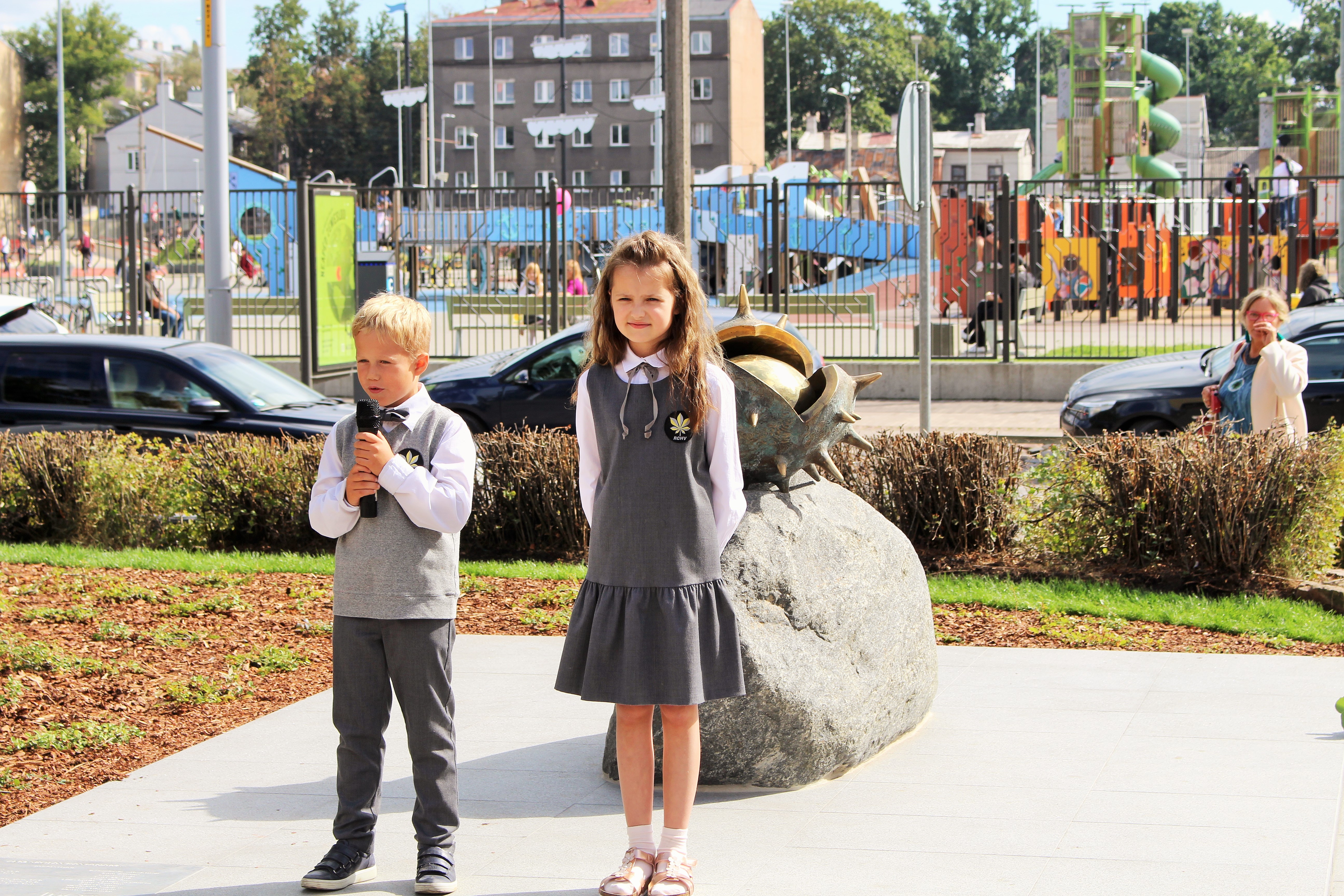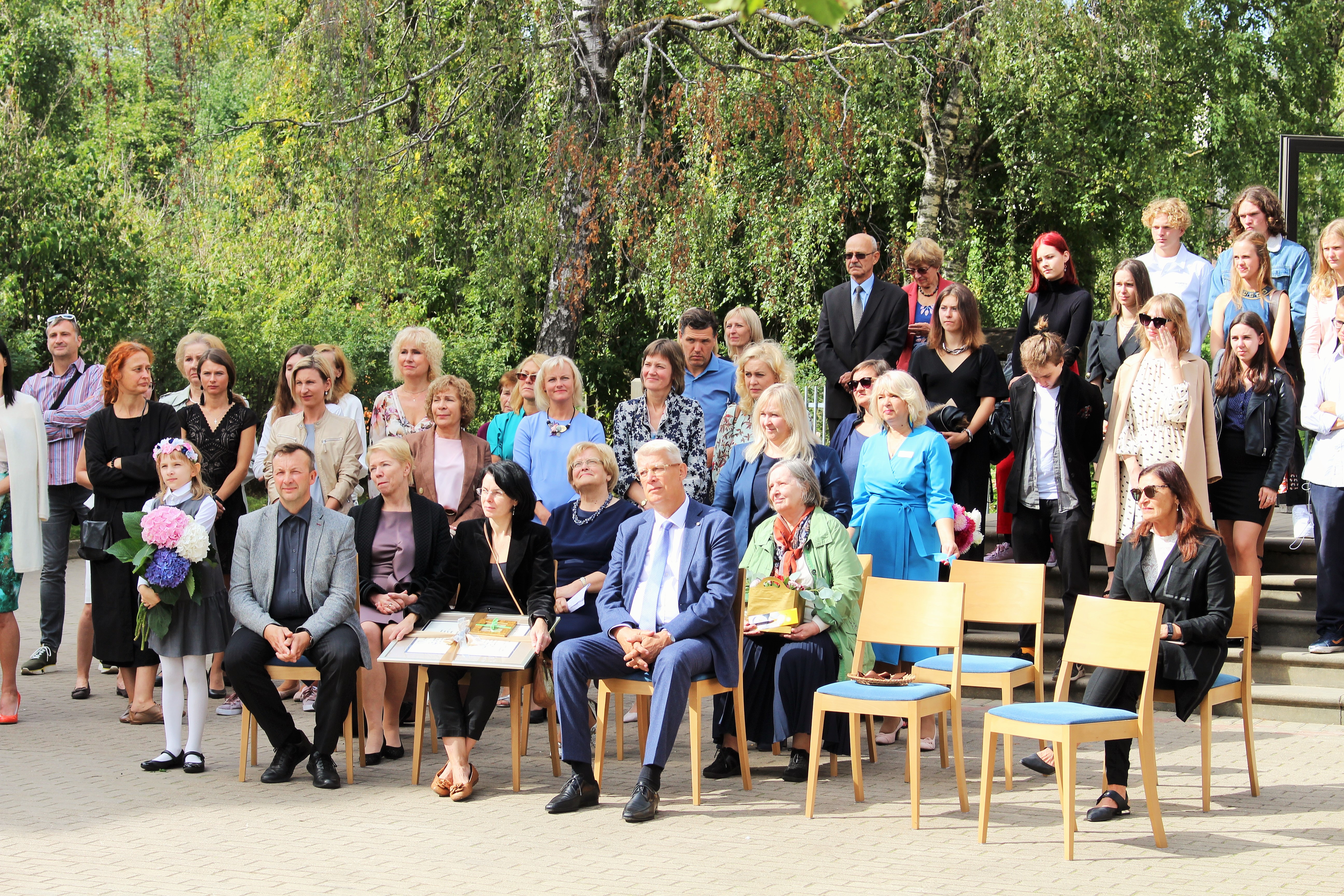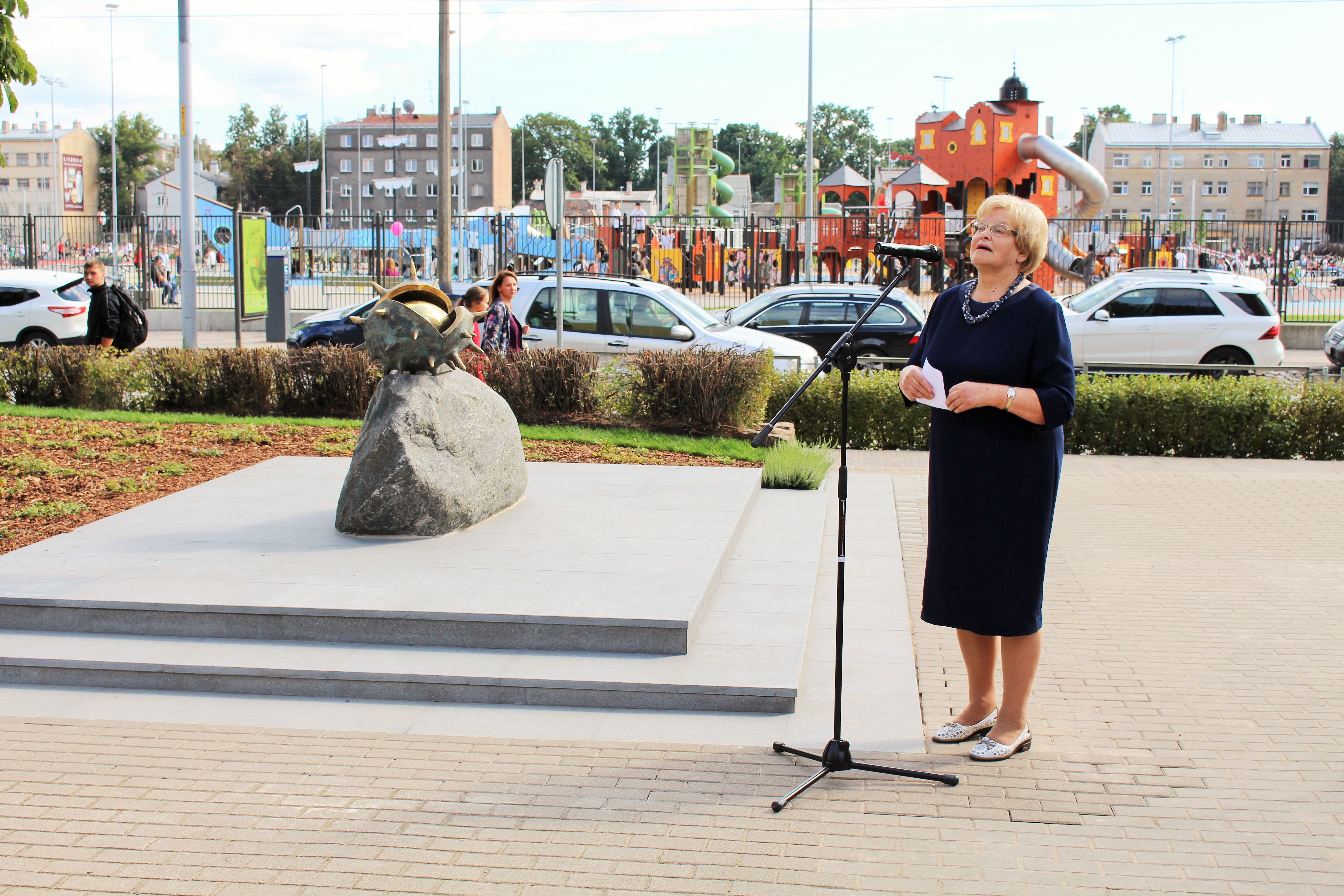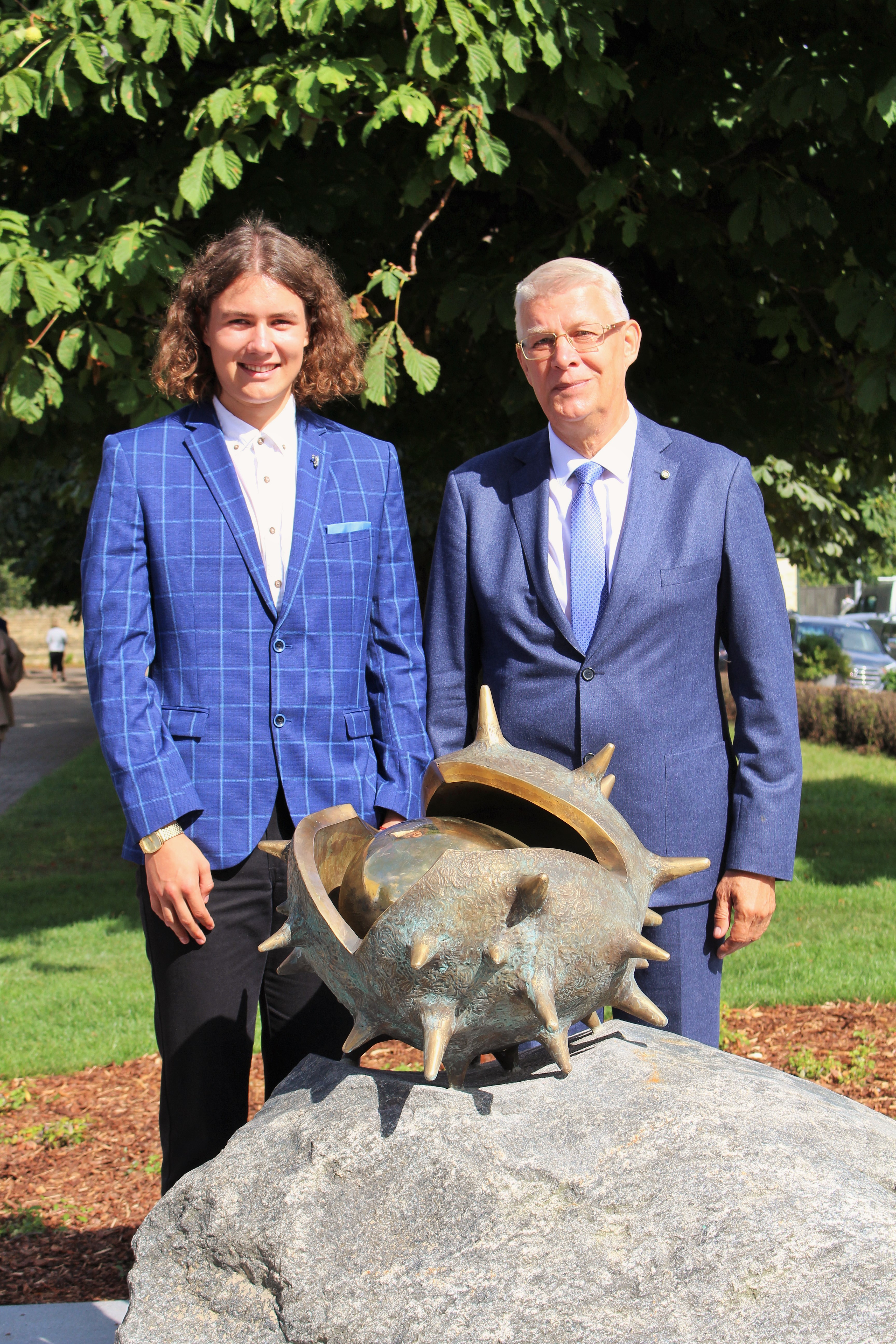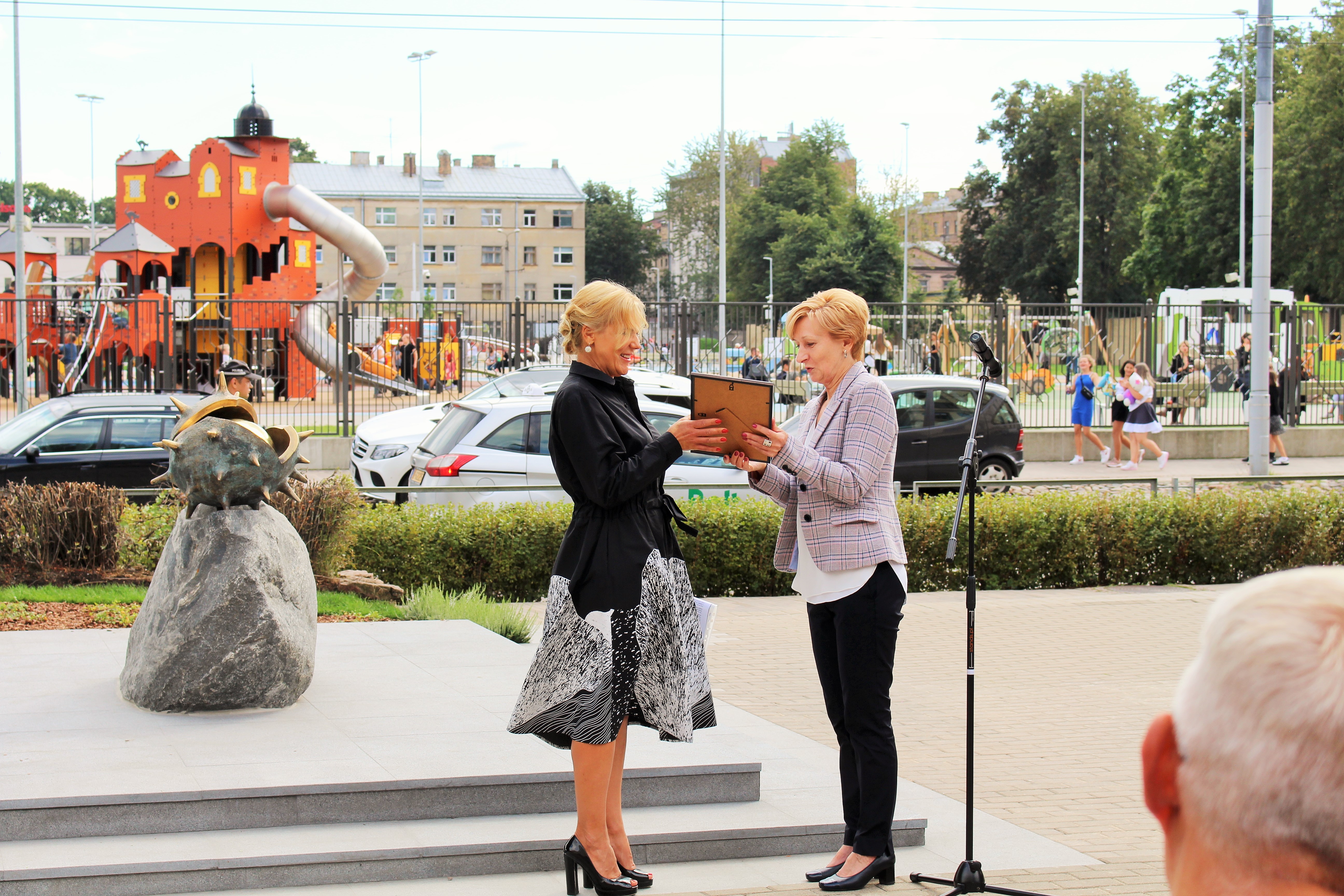 Atklāšanā piedalījās projekta patrons, Valsts prezidents Valdis Zatlers, skulptūras autors – tēlnieks Valtis Barkāns, atbalstītāji – dr. Dace Matule, dr. Evija Rodke – Sproģe, ainavu arhitekte Ilze Rukšāne, kuplā skaitā skolas bijušie un esošie pedagogi, absolventu klašu pārstāvji, himnas ieraksta solists Nauris Indzeris.