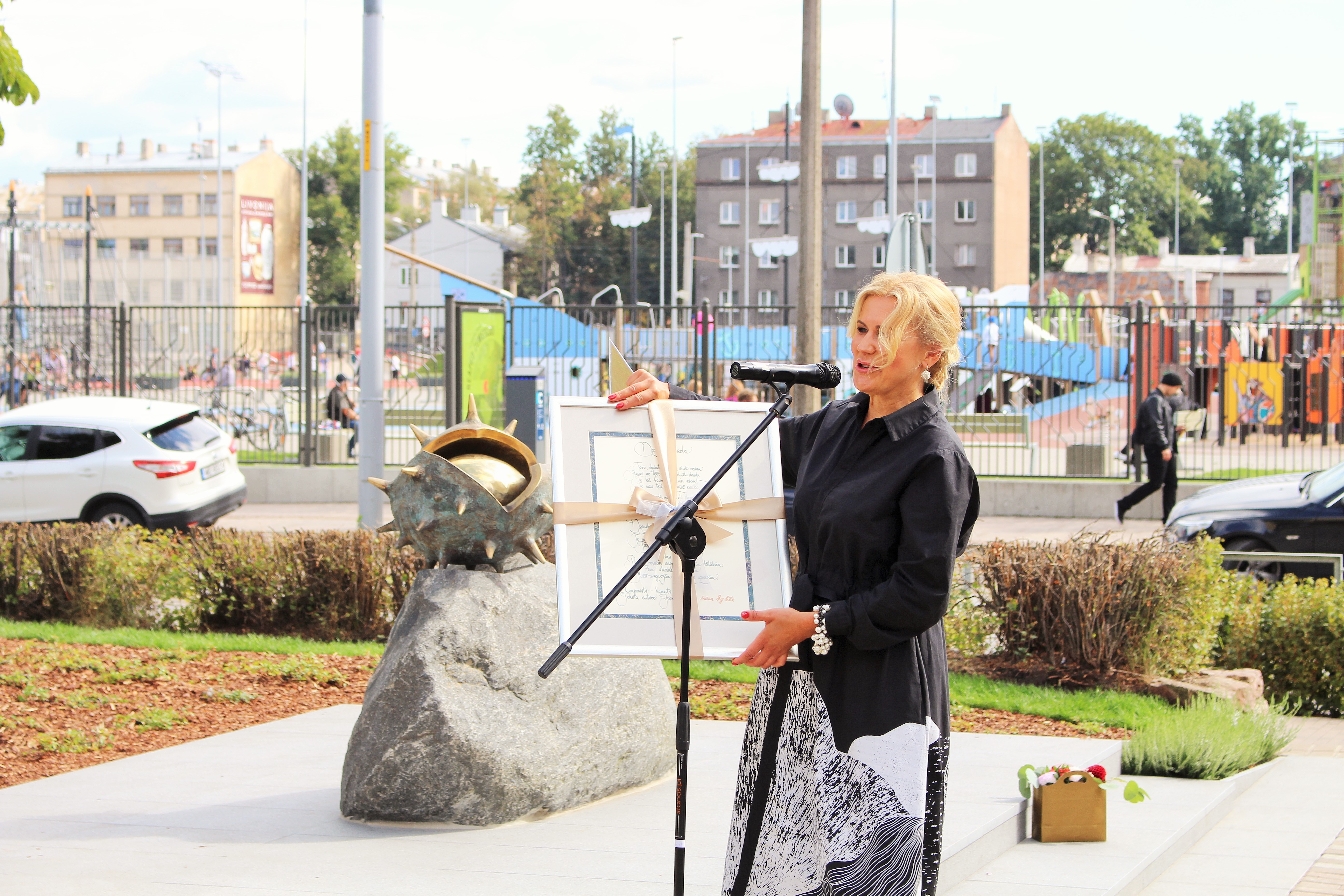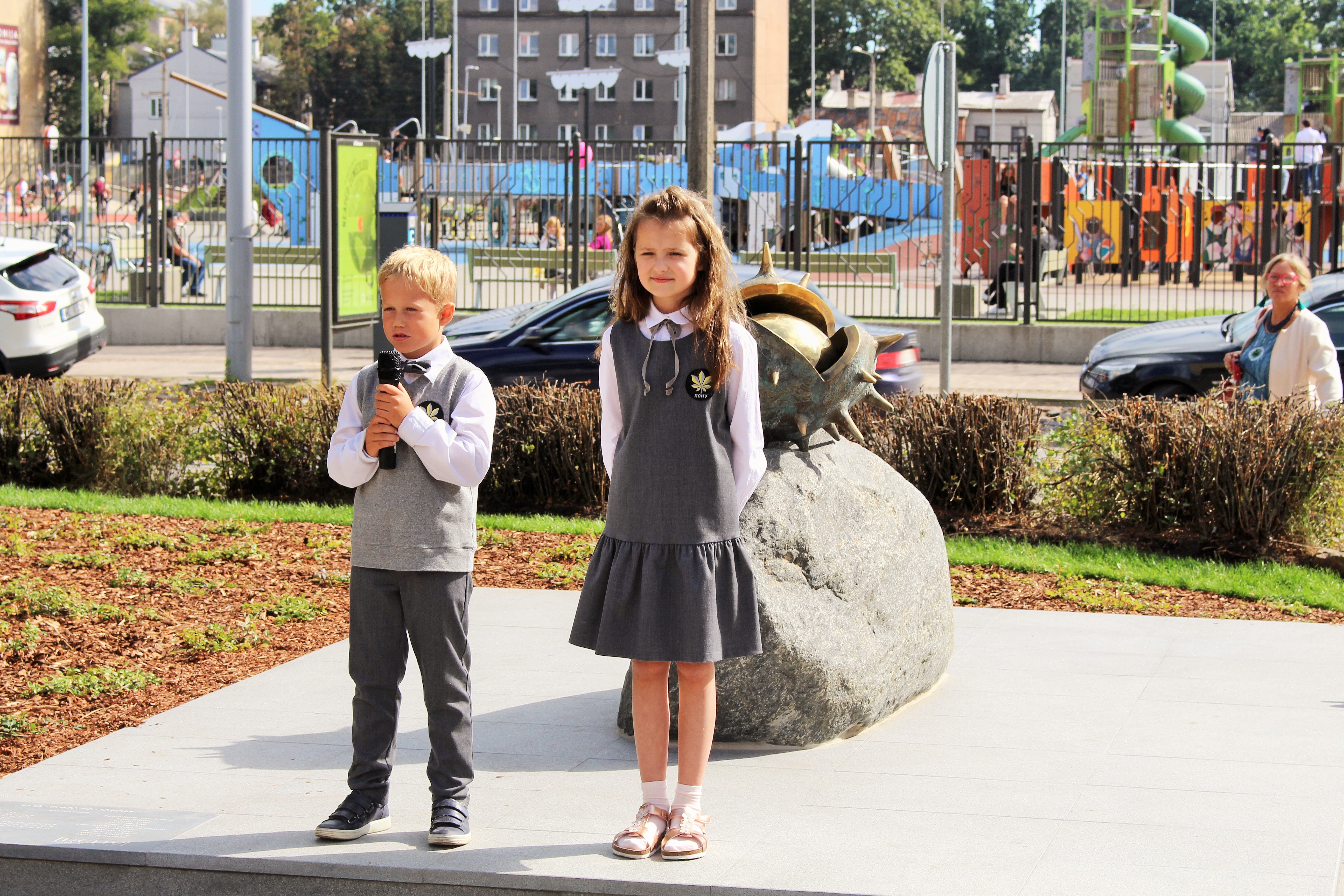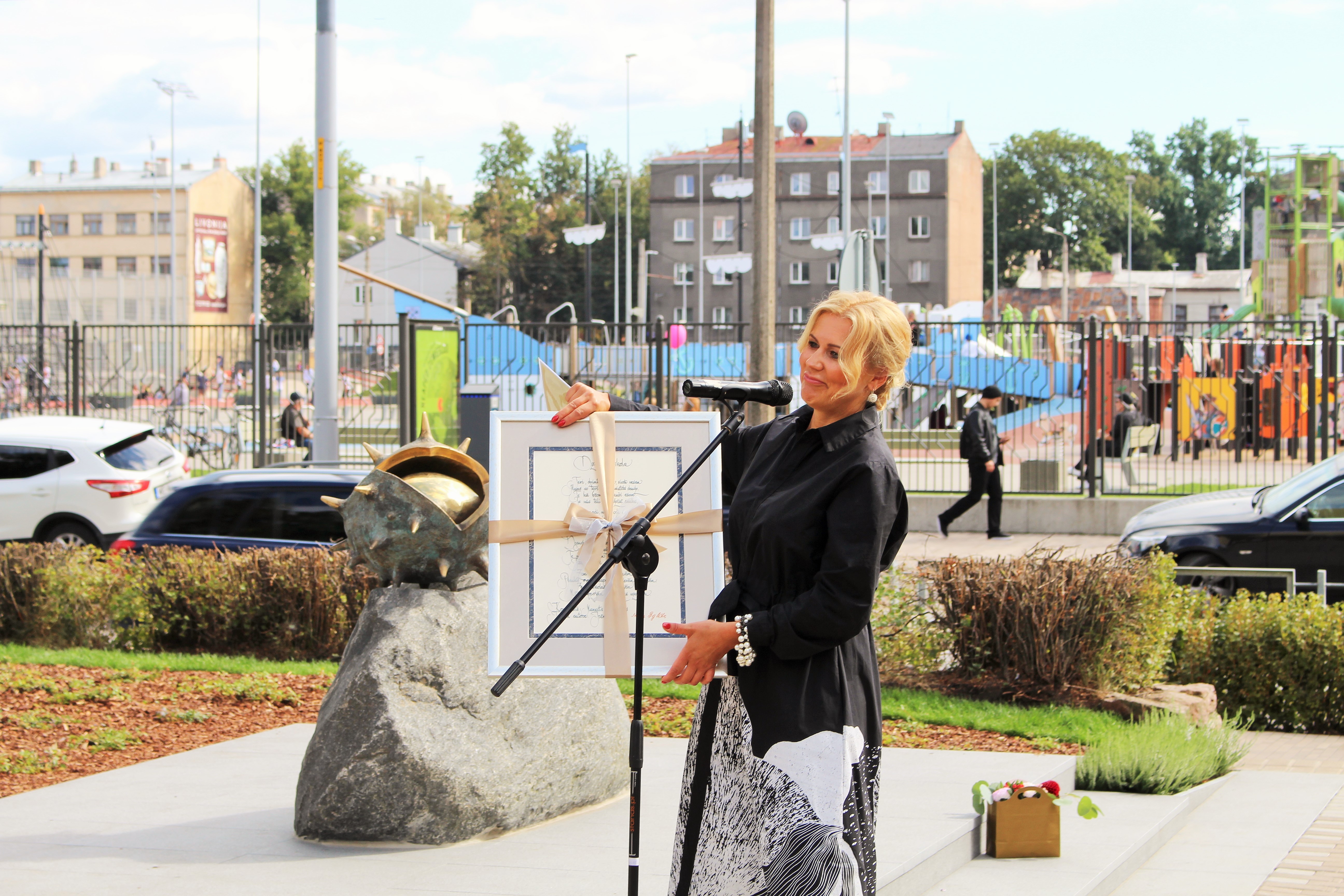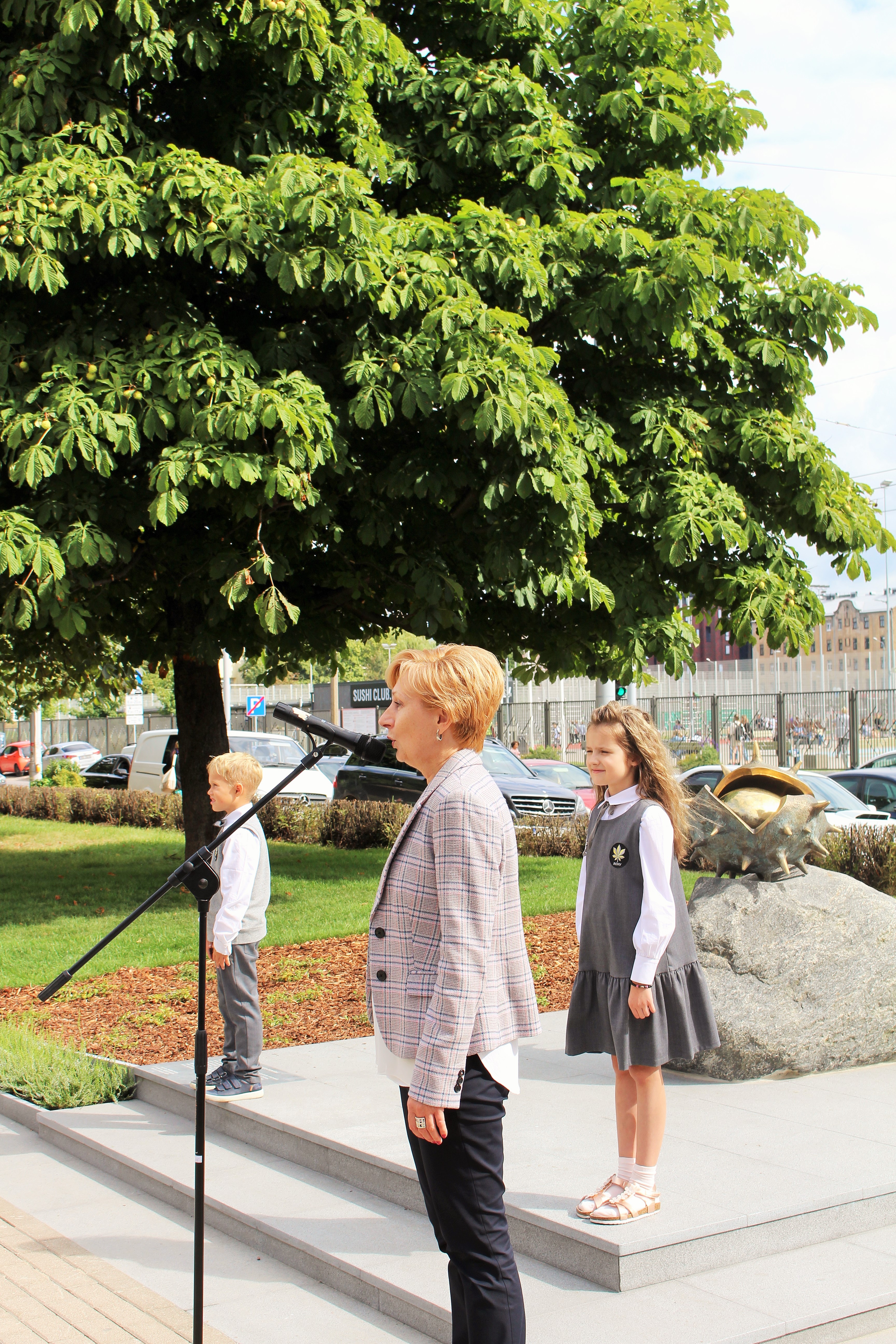Atklāšanā piedalījās projekta patrons, Valsts prezidents Valdis Zatlers, skulptūras autors – tēlnieks Valtis Barkāns, atbalstītāji – dr. Dace Matule, dr. Evija Rodke – Sproģe, ainavu arhitekte Ilze Rukšāne, kuplā skaitā skolas bijušie un esošie pedagogi, absolventu klašu pārstāvji, himnas ieraksta solists Nauris Indzeris.