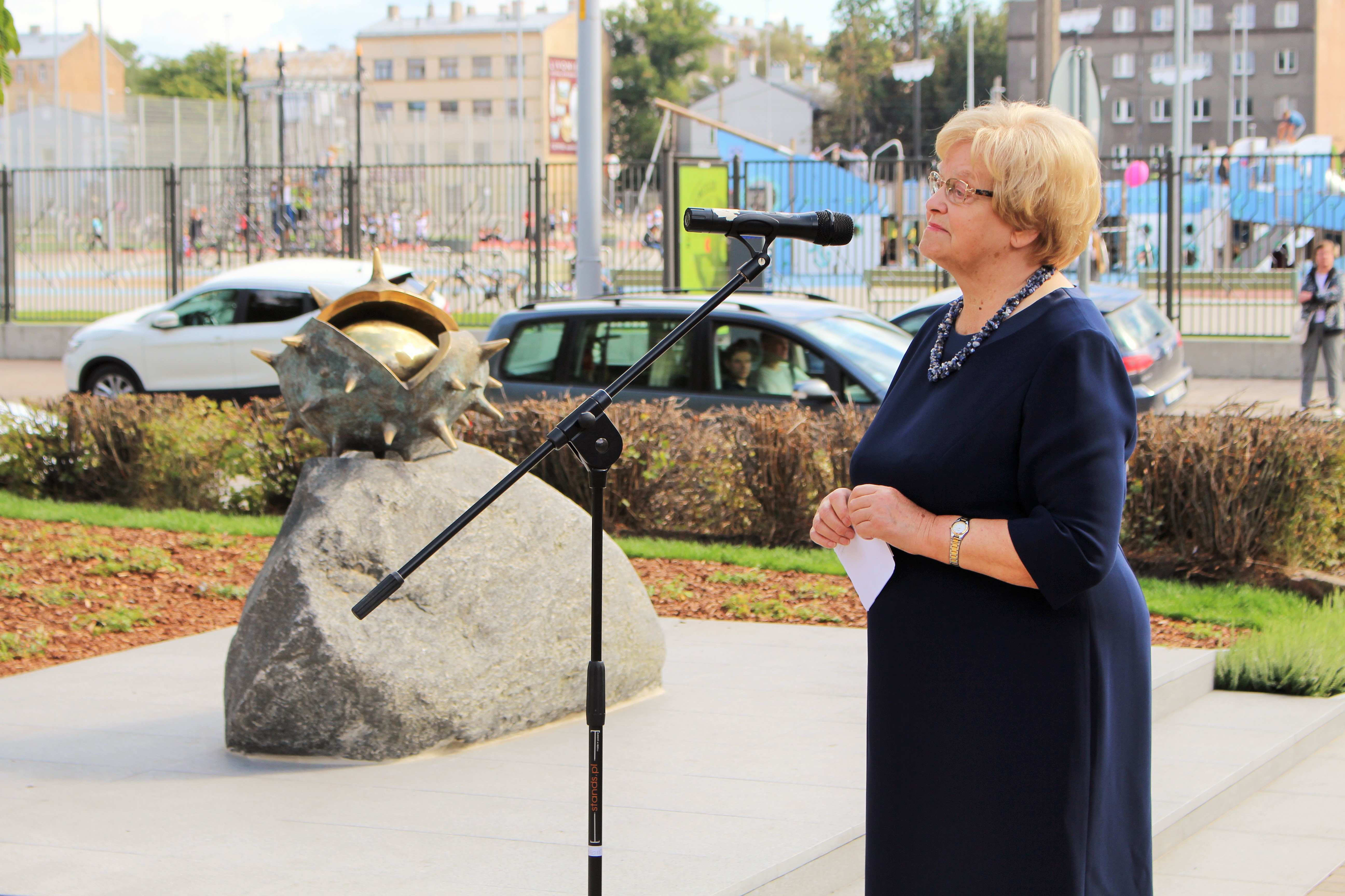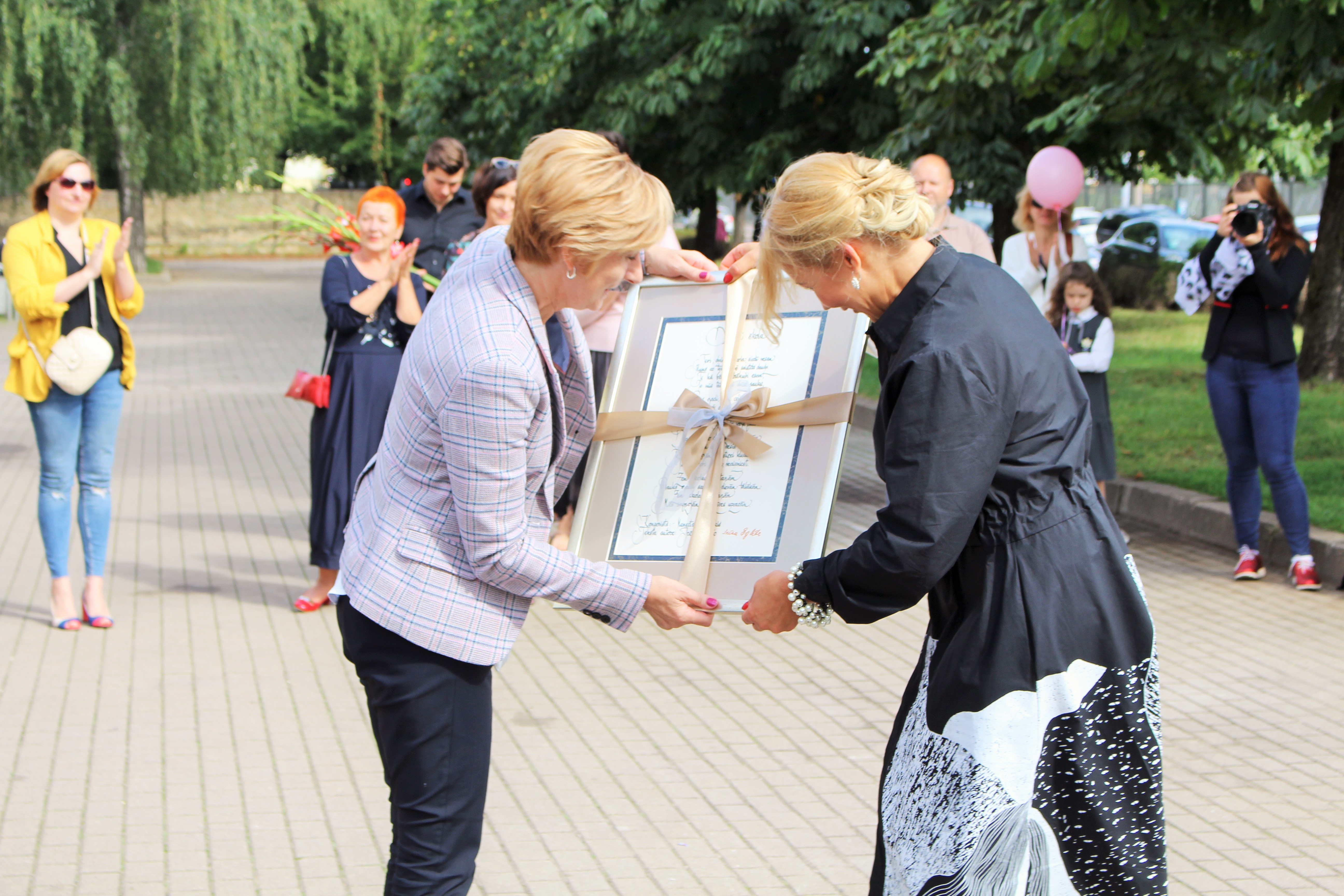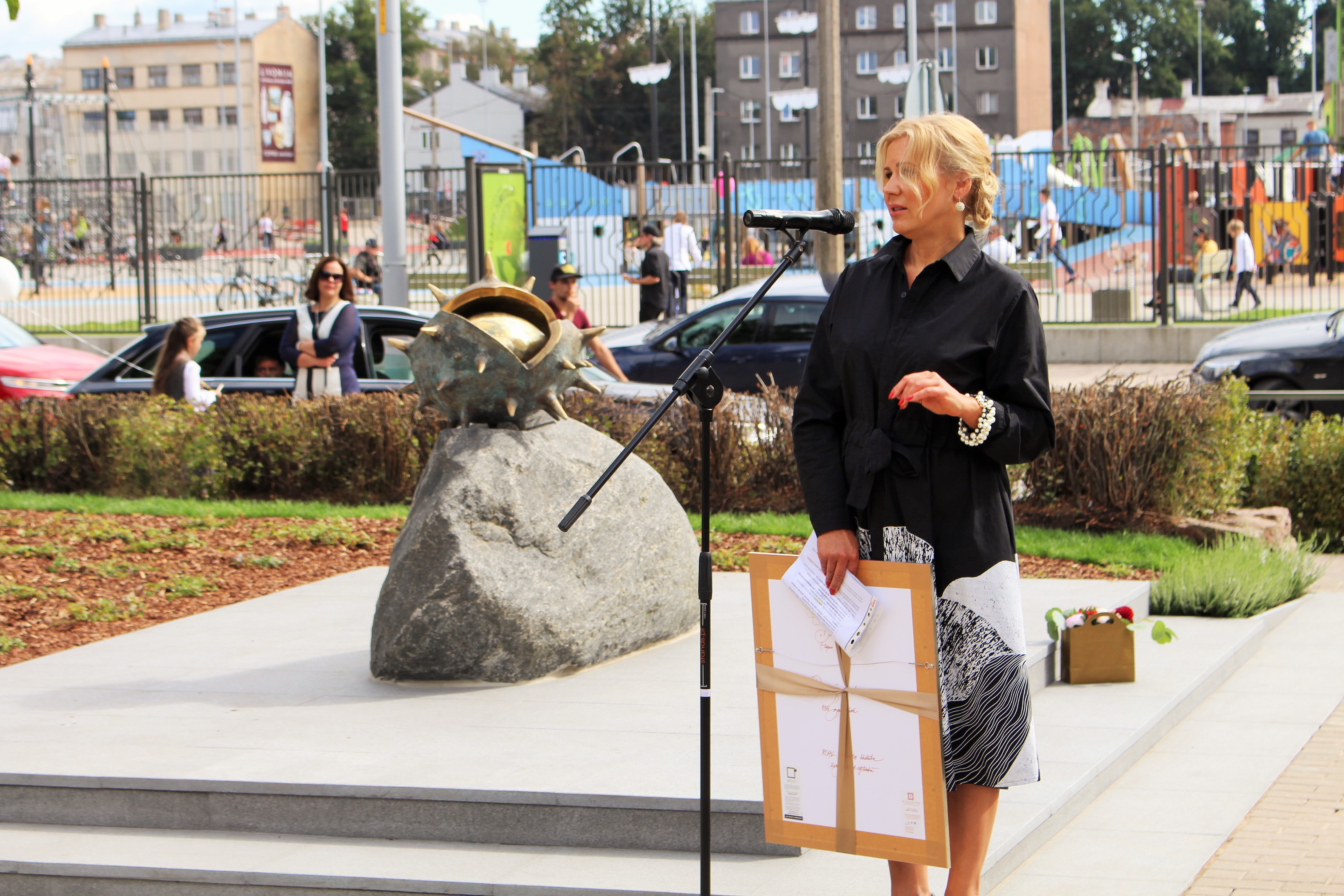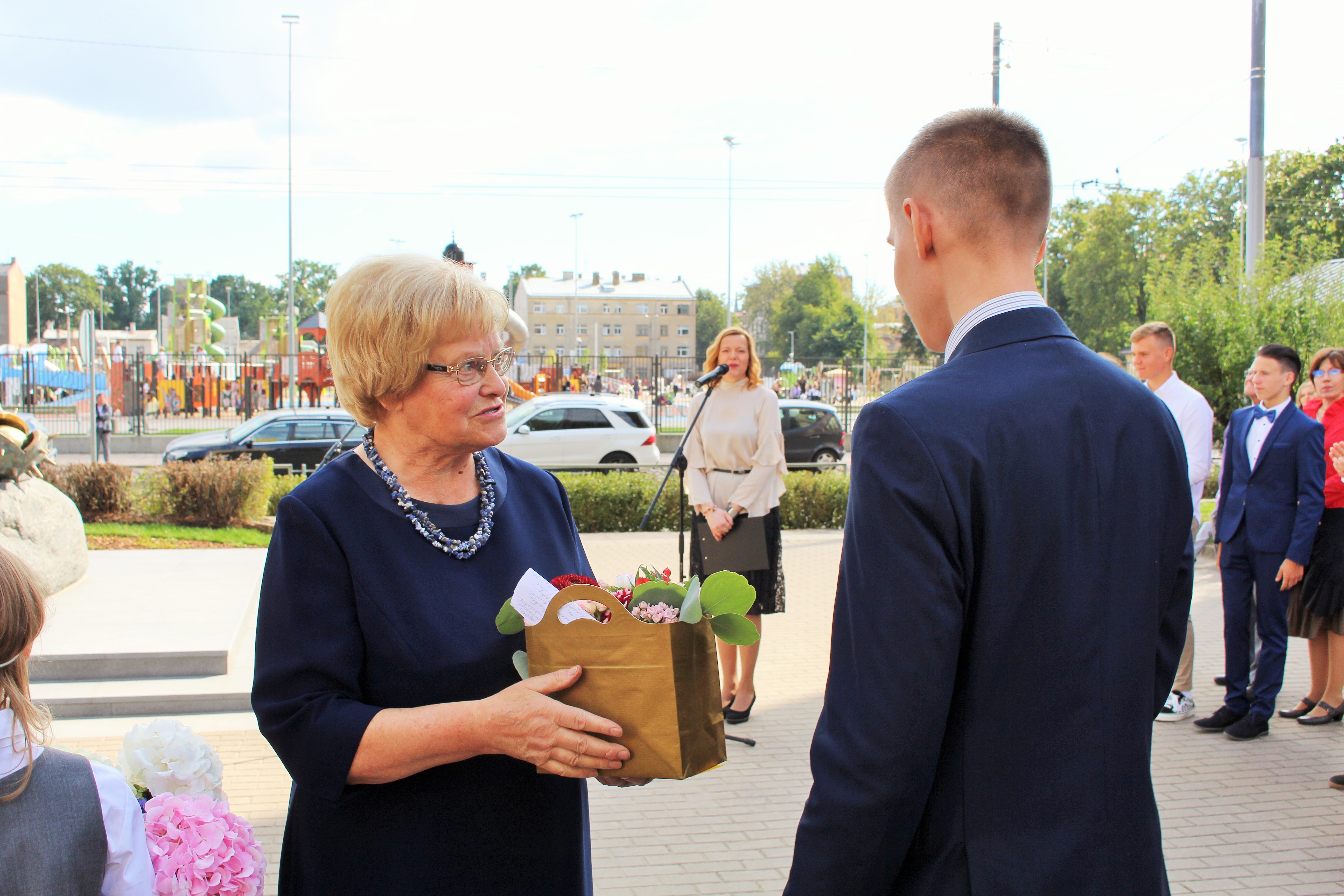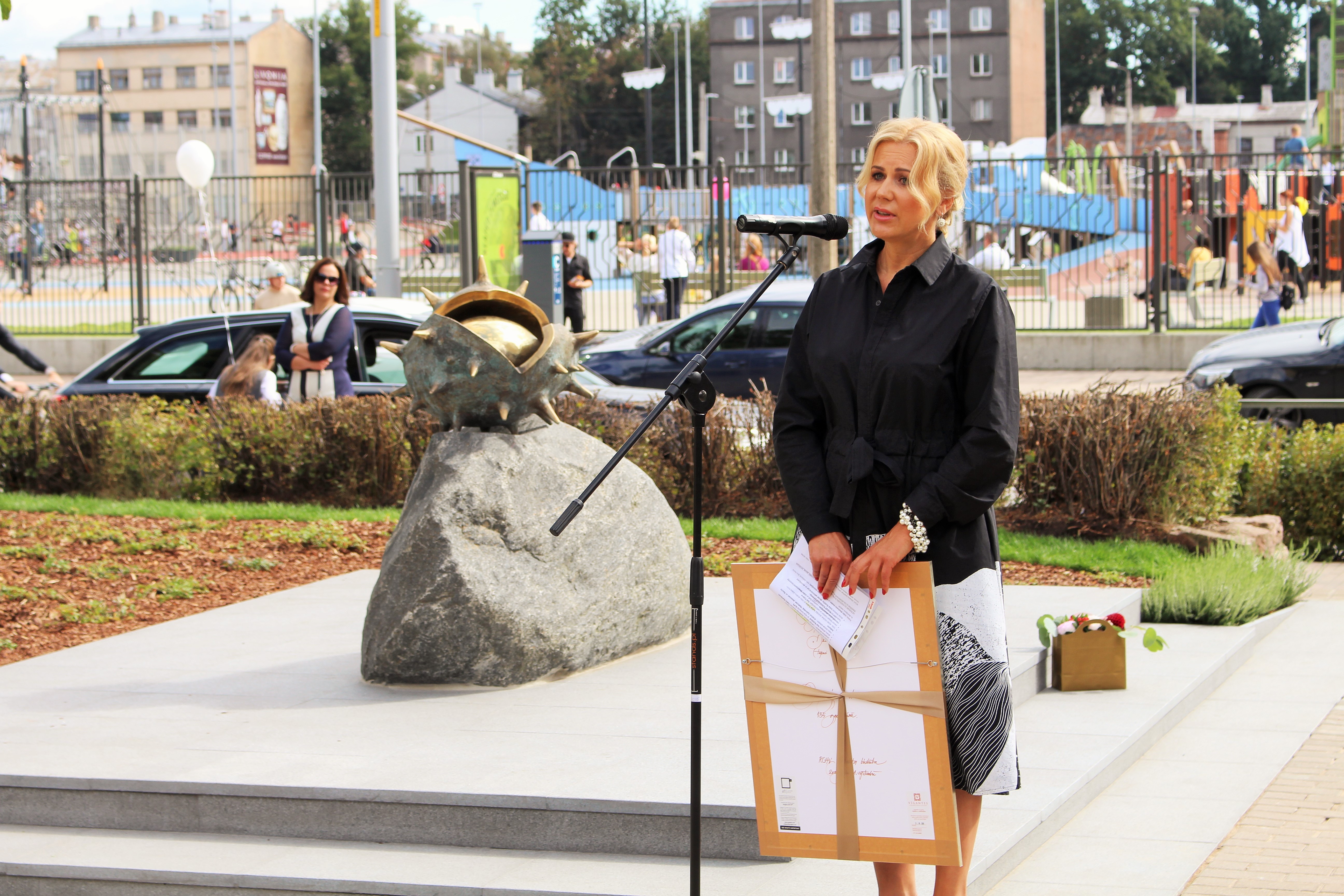 Atklāšanā piedalījās projekta patrons, Valsts prezidents Valdis Zatlers, skulptūras autors – tēlnieks Valtis Barkāns, atbalstītāji – dr. Dace Matule, dr. Evija Rodke – Sproģe, ainavu arhitekte Ilze Rukšāne, kuplā skaitā skolas bijušie un esošie pedagogi, absolventu klašu pārstāvji, himnas ieraksta solists Nauris Indzeris.